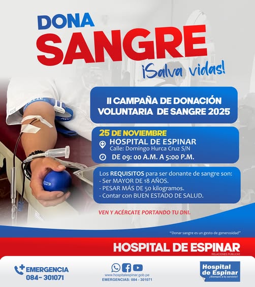 Con el firme propósito de contar con suficientes unidades de sangre para la atención de pacientes críticos y diversos casos de emergencia, el Hospital de Espinar, a través del Servicio de Banco de Sangre, llevará a cabo la II CAMPAÑA DE DONACIÓN VOLUNTARIA DE SANGRE 2025 el próximo martes 25 de noviembre del año curso.