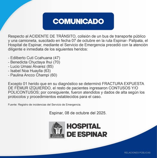 Siendo que a partir de la fecha se cuenta con un flamante funcionario al frente del Hospital de Espinar, se hace necesario reiterar a nuestras autoridades y población en general, su cooperación y confianza, únicamente con firme propósito de hacer realidad un servicio de calidad a favor de los usuarios de nuestro primer nosocomio de la provincia.