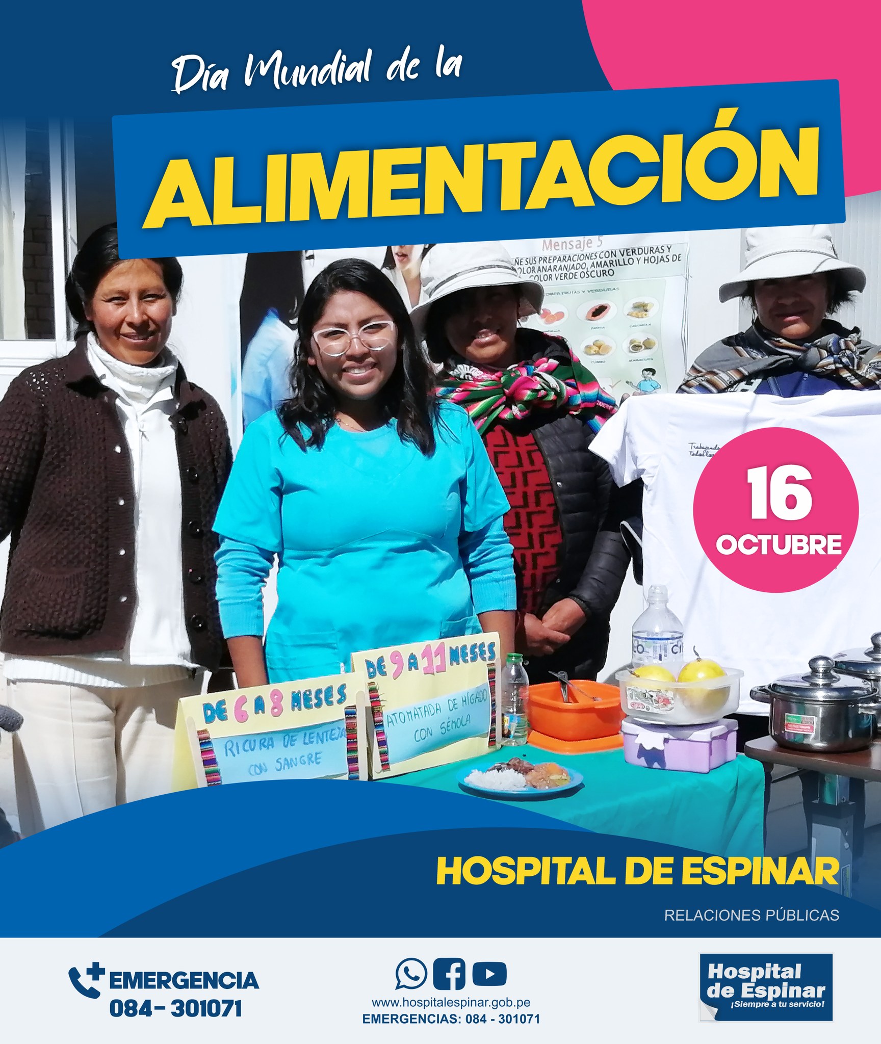 Siendo que el 16 de octubre de cada año se conmemora el DÍA MUNDIAL DE LA ALIMENTACIÓN, el Hospital de Espinar, viene impulsando actividades con la finalidad de informar y sensibilizar a la población respecto a las acciones que se deben adoptar para garantizar una alimentación segura, adecuada, variada y equilibrada.
