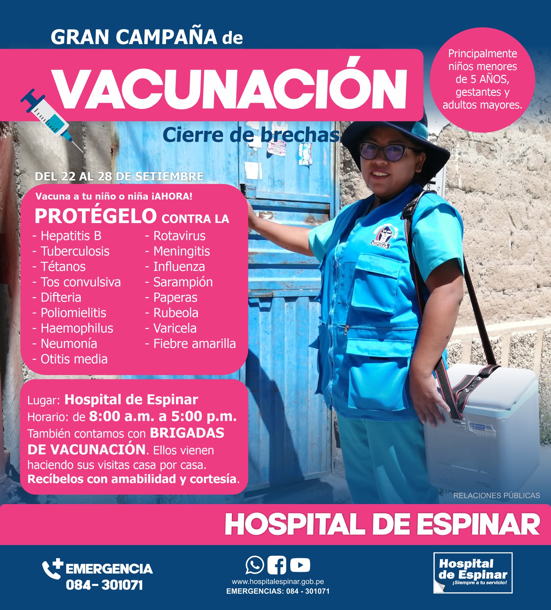 Siendo que a partir de este próximo 26 de abril se da inicio a la “SEMANA DE VACUNACIÓN EN LAS AMÉRICAS”, el Hospital de Espinar, a través de la Estrategia de Inmunizaciones y, en estrecha coordinación con diferentes establecimientos de salud, viene promoviendo e implementando diferentes acciones para lograr una ÓPTIMA COBERTURA EN LA VACUNACIÓN de los niños menores de 5 años.