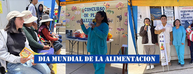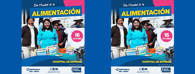 Siendo que el 16 de octubre de cada año se conmemora el DÍA MUNDIAL DE LA ALIMENTACIÓN, el Hospital de Espinar, viene impulsando actividades con la finalidad de informar y sensibilizar a la población respecto a las acciones que se deben adoptar para garantizar una alimentación segura, adecuada, variada y equilibrada.